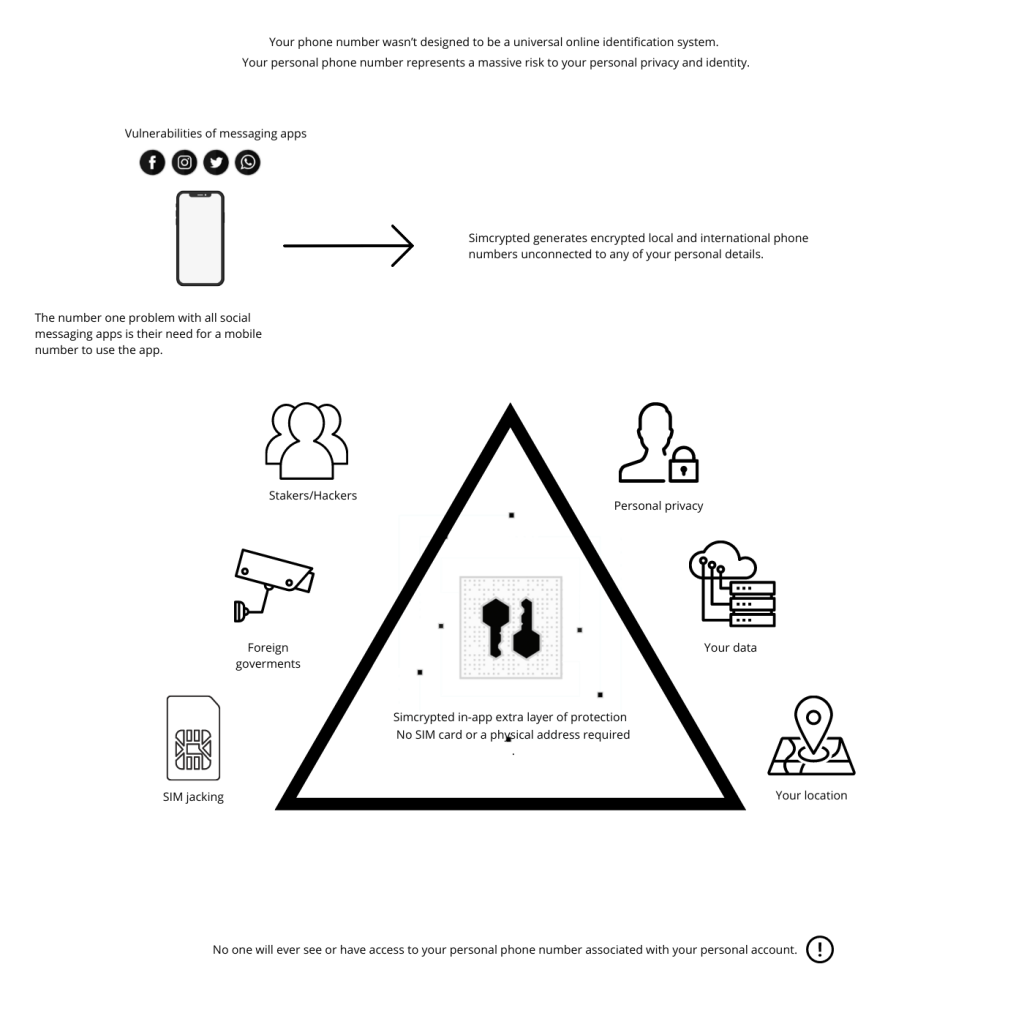 Simcrypted generates encrypted local and international phone numbers unconnected to any of your personal details. They are purposely designed to work across all your favorite messaging apps without the inherent risks your personal mobile number brings. So by using Simcrypted, you can stop sharing your personal number, which helps protect you against Big Tech, fraud and hacks, the miss-selling of your private information, unwanted intrusion, and much more.